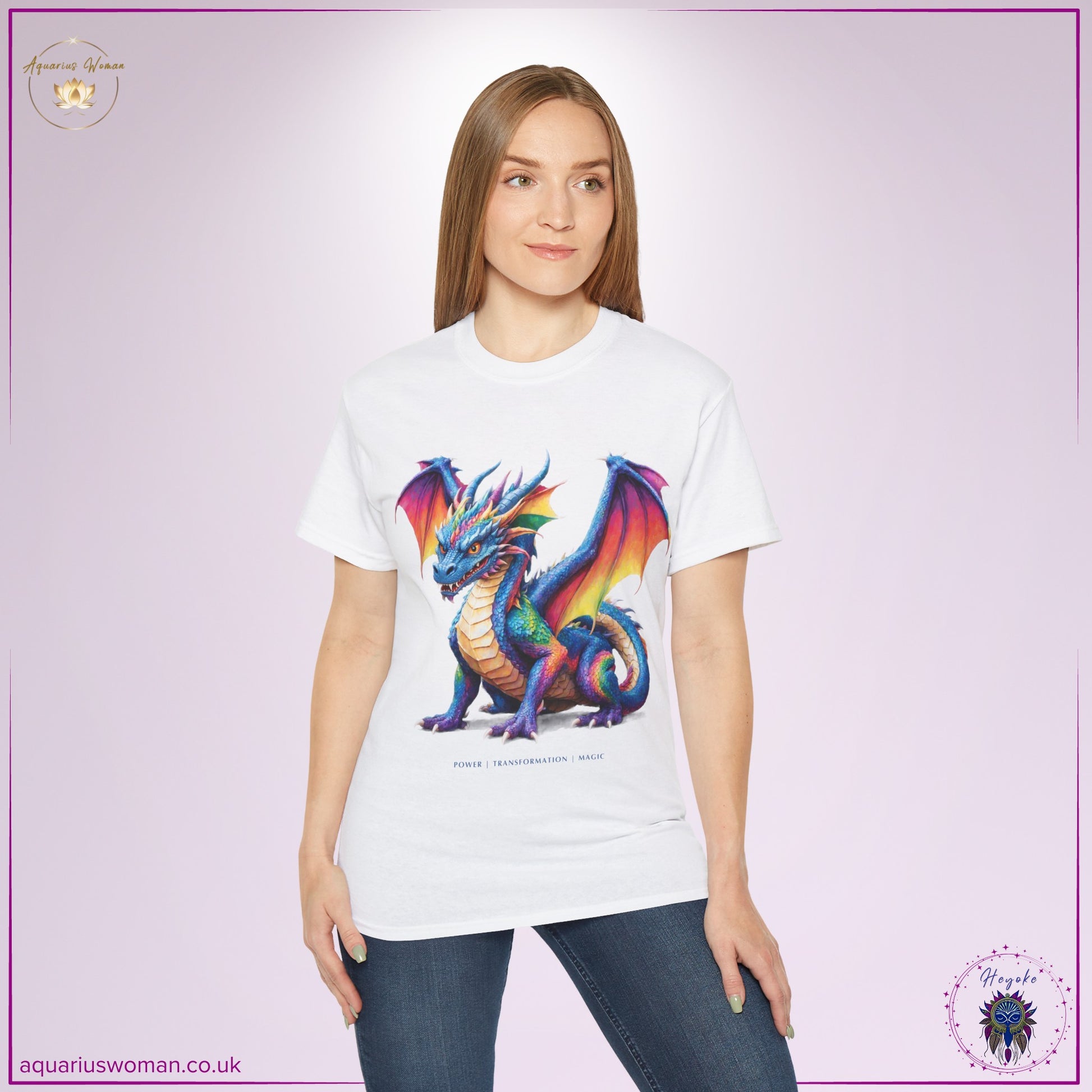 This tee showcases a majestic rainbow-hued dragon, adorned with intricate details and powerful energy, symbolising the fusion of elemental forces. In spiritual traditions, dragons are revered as protectors, wisdom-keepers, and harbingers of transformation, reminding us to harness our inner fire and embrace limitless growth.