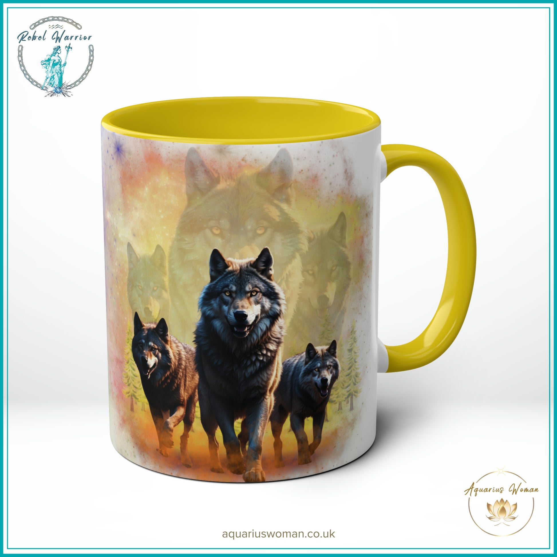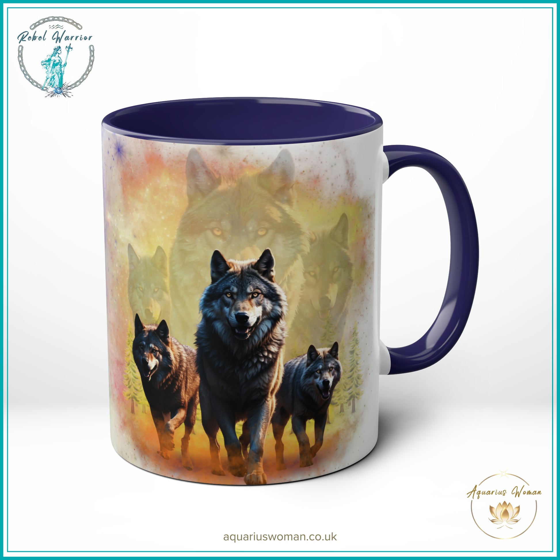 On one side, the Night Watchers design unfolds, a mesmerising depiction of three wolves under the glow of the moon and shimmering northern lights, representing vigilance, protection, and the unseen forces guiding us through the darkest hours. Turn the mug to reveal the Dawn Guardians design, where majestic wolves emerge into the light, inspired by ancestral wisdom and the courage to embrace renewal.