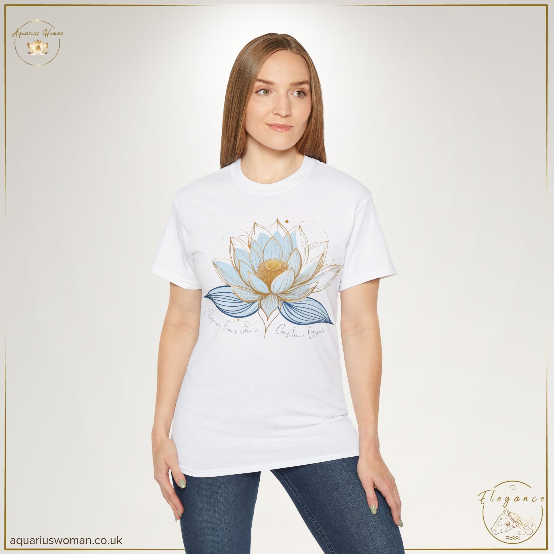 The T-shirt features an exquisite blue and gold lotus design, a timeless symbol of purity, strength, and transformation. Encircling the lotus are delicate swirling lines, representing the graceful flow of energy that comes from self-assurance. Paired with the inspiring mantra, "Elegance flows where Confidence grows", this tee empowers you to embrace your journey with poise and resilience.