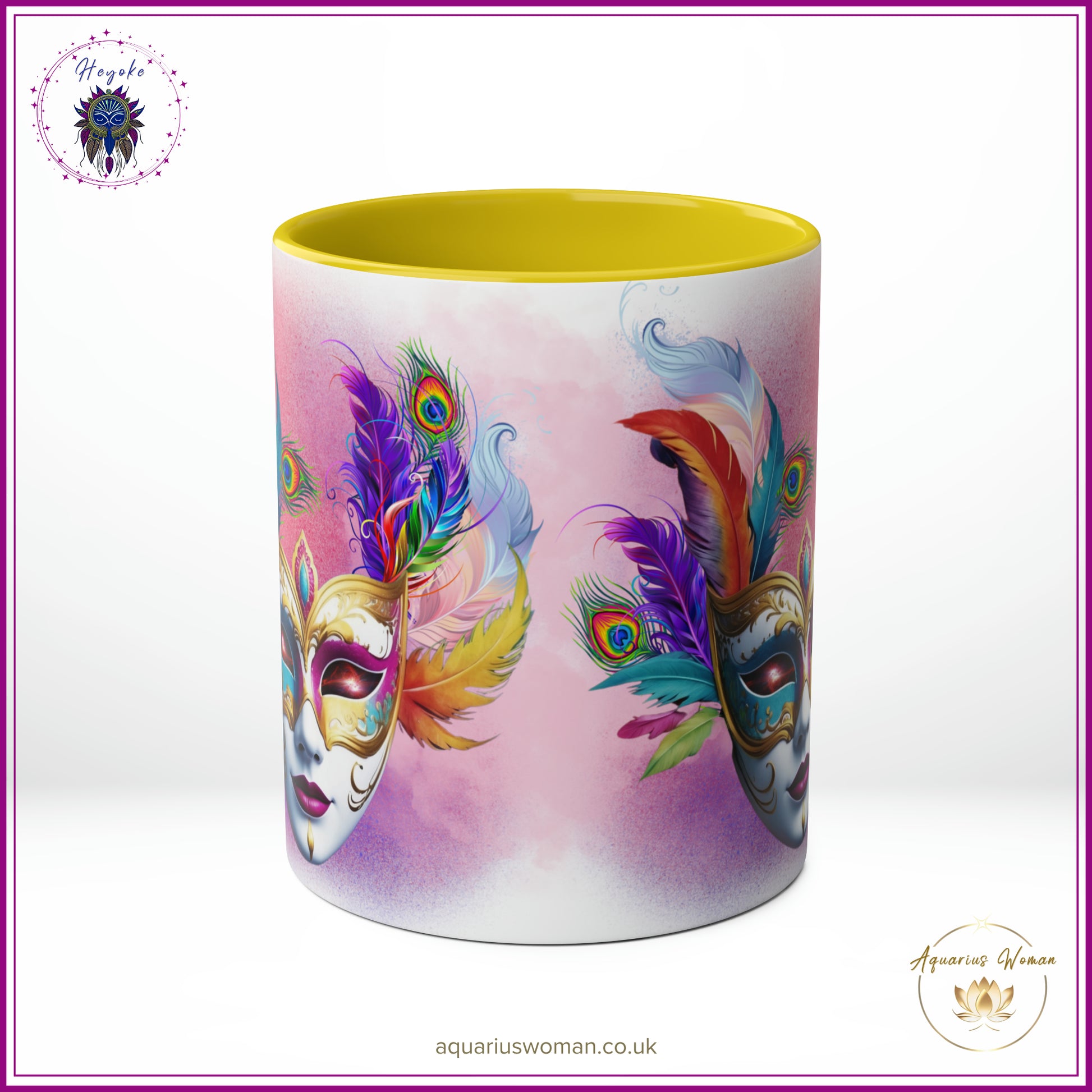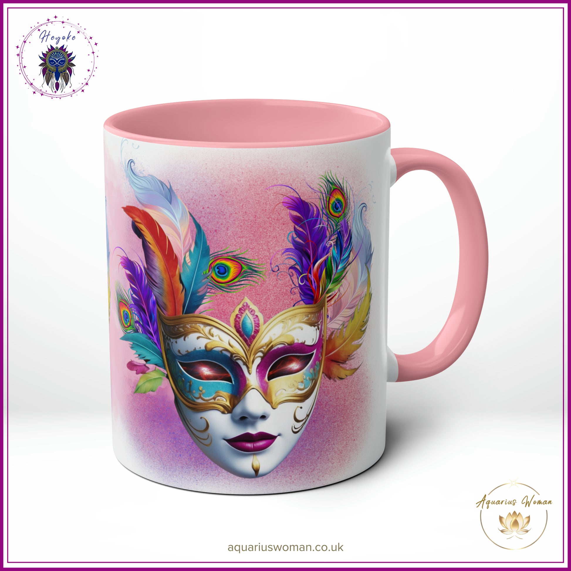 Step into a world of mysticism and shamanic wisdom with the "Cosmic Masquerade" Ceramic Mug from the Aquarius Woman Heyoke Collection. Crafted for those who seek to explore the sacred and the unseen, this mug features a mesmerising design of a masquerade mask adorned with intricate feathers, cosmic eyes, and elements that evoke ancient traditions. The eyes of the mask seem to open into distant galaxies, hinting at the infinite wisdom and dimensions that the Heyoka spirit embraces.