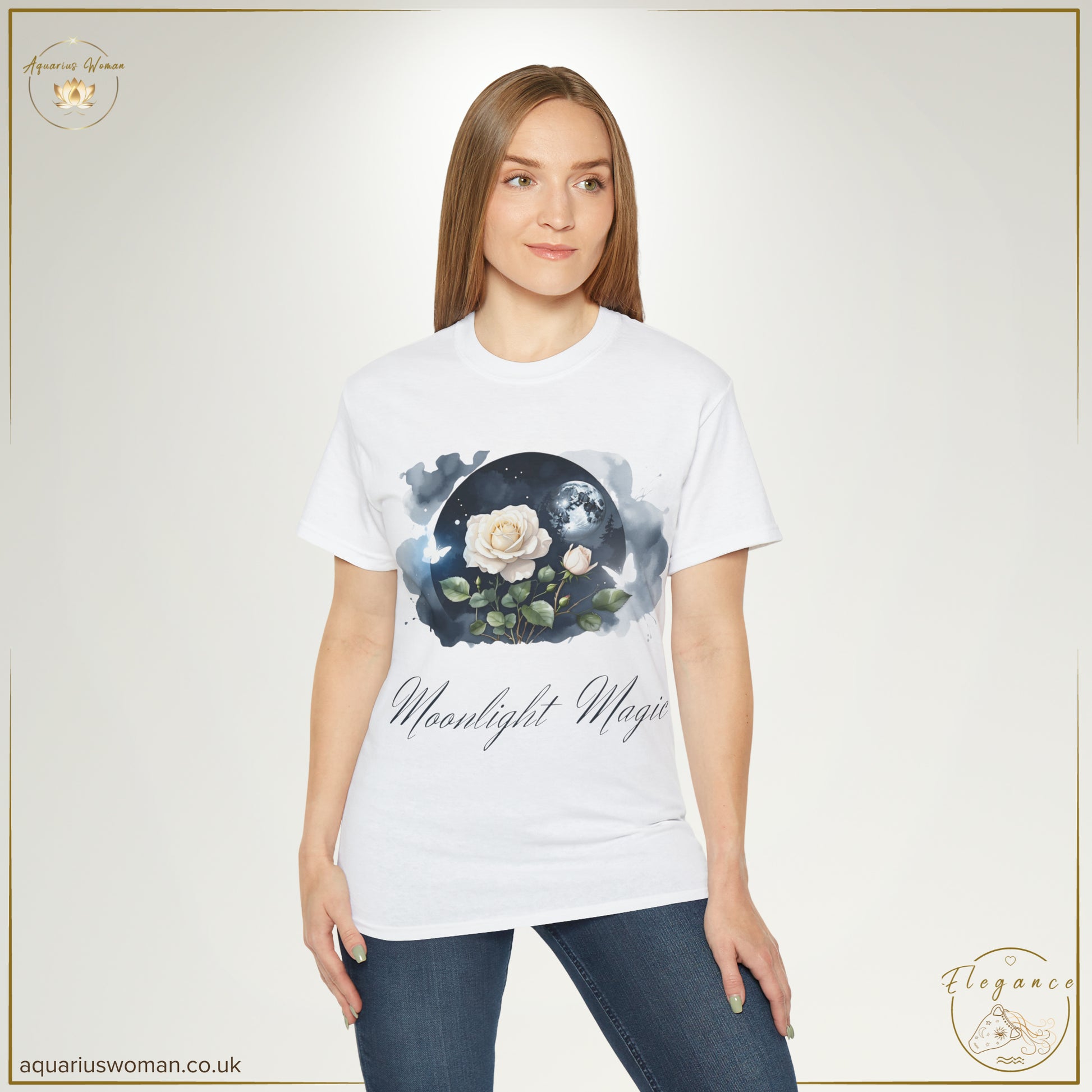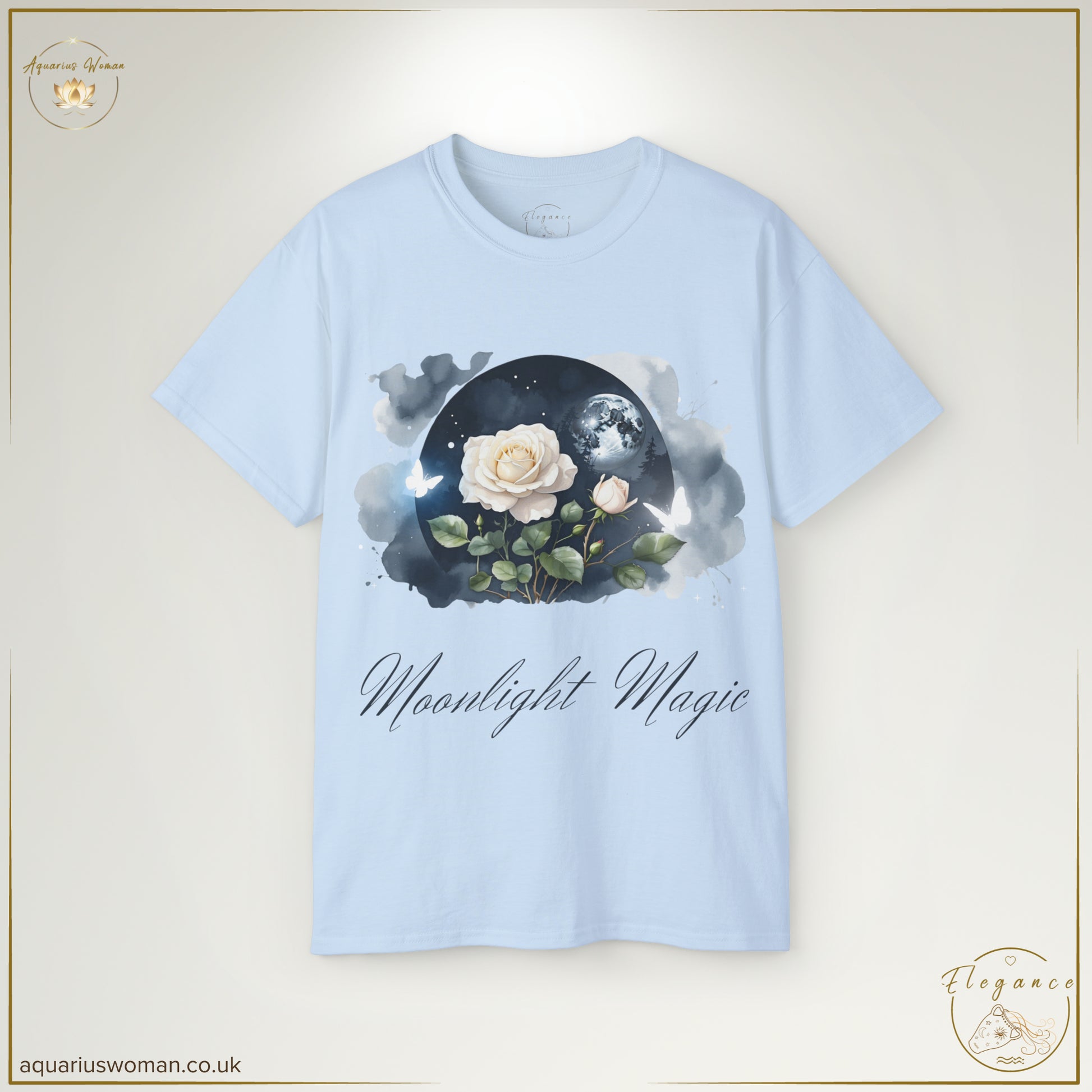 At the heart of this tee is a delicate white rose, depicted in exquisite detail, its soft petals glowing under a stylized crescent moon. The moon, paired with twinkling stars and a distant planet, is rendered in enchanting shades of dark blue and grey with watercolour-like washes that evoke a dreamy, celestial ambiance. Beneath this enchanting imagery, the words "Moonlight Magic" appear in a graceful cursive font, perfectly complementing the design’s ethereal theme.