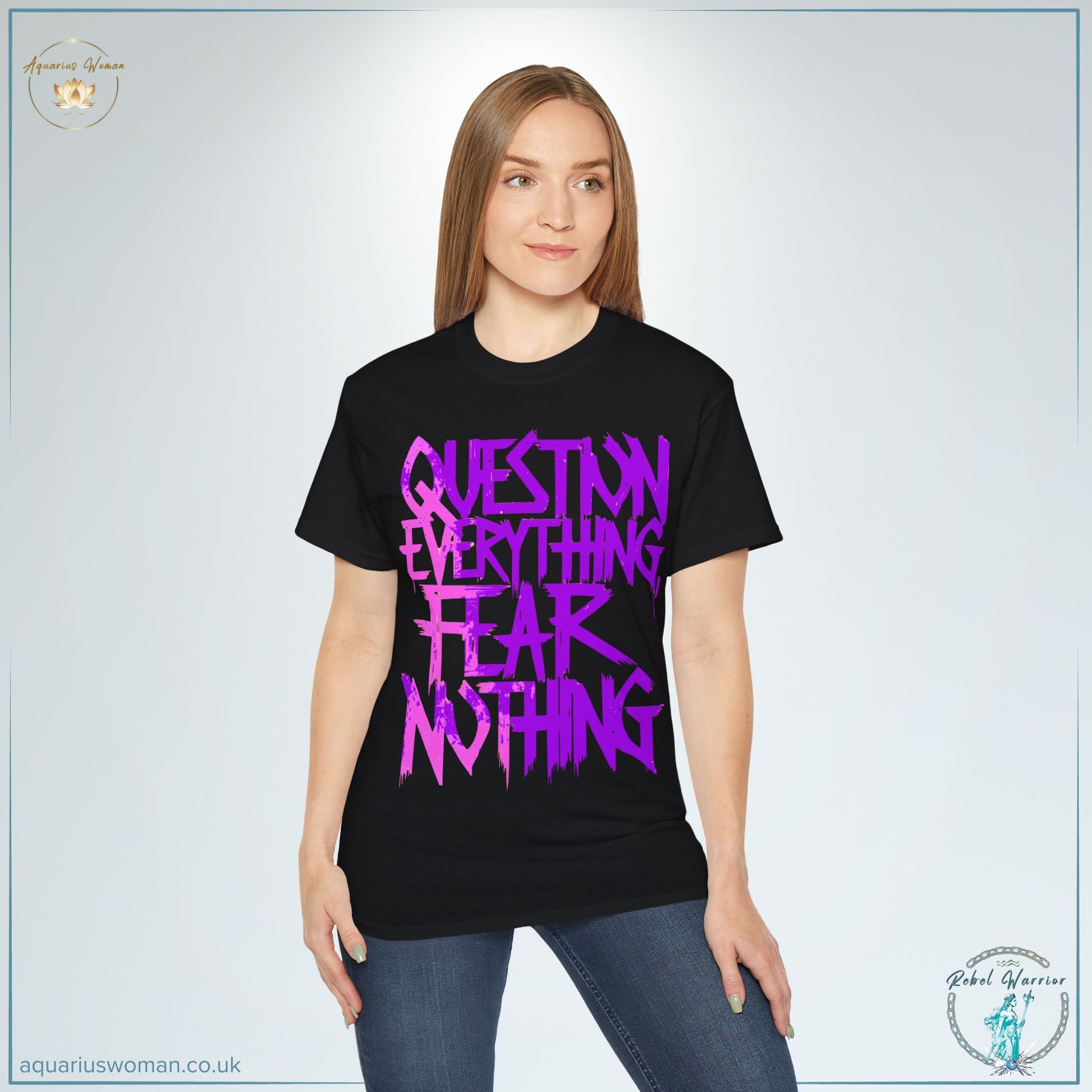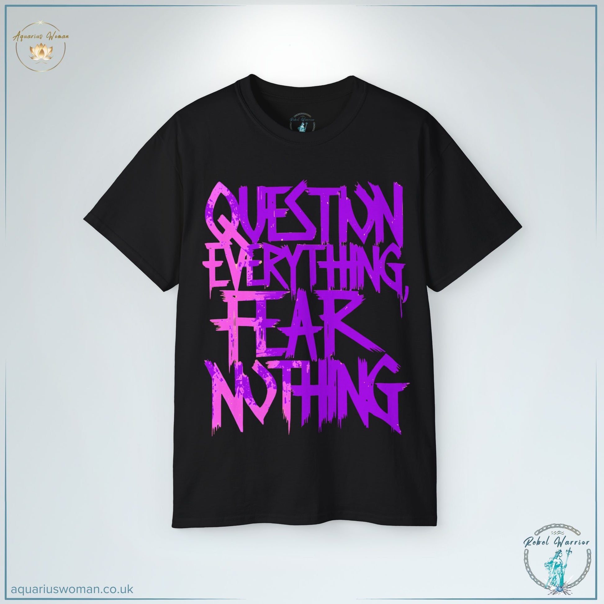 Defy expectations, challenge authority, and embrace unapologetic truth-seeking with the "Question Everything, Fear Nothing" T-Shirt from the Rebel Warrior Collection by Aquarius Woman. Designed for free-thinkers, disruptors, and warriors of truth, this high-impact graphic design serves as a reminder that fear is the tool of control—but knowledge is power.