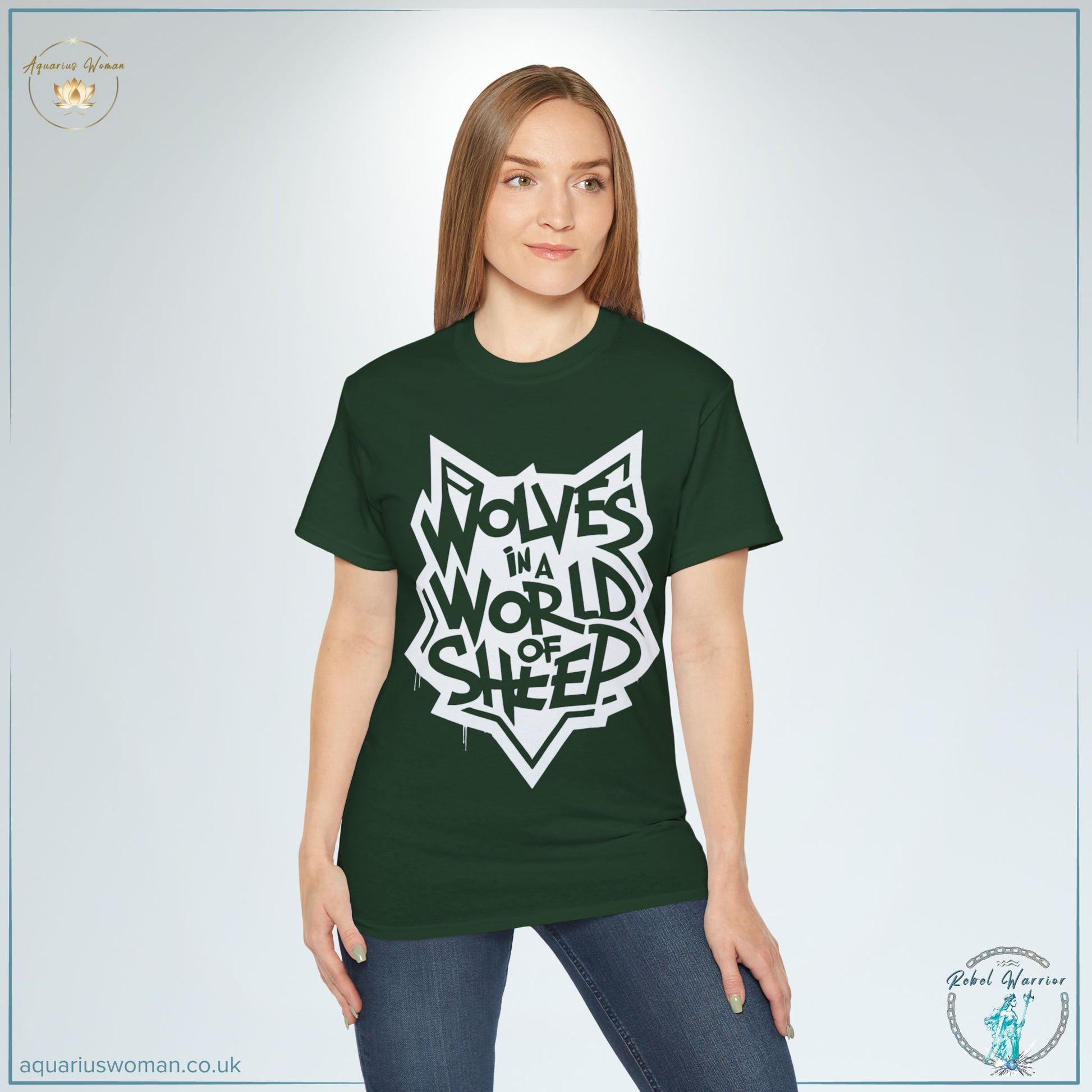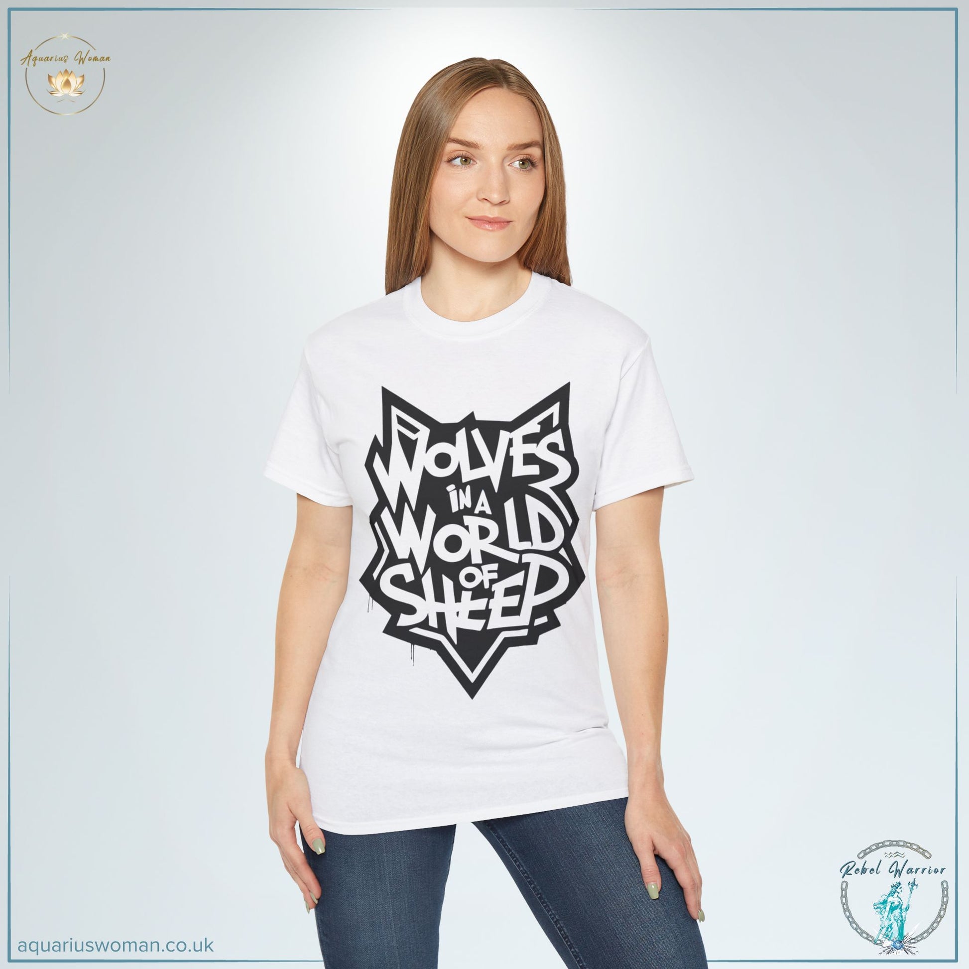 Unleash your inner rebel with the "Wolves in a World of Sheep" T-Shirt from the Rebel Warrior Collection by Aquarius Woman. This striking street-art-inspired design features bold graffiti typography sculpted into the shape of a powerful wolf’s head, symbolising individuality, strength, and defiance in a world that demands conformity.
